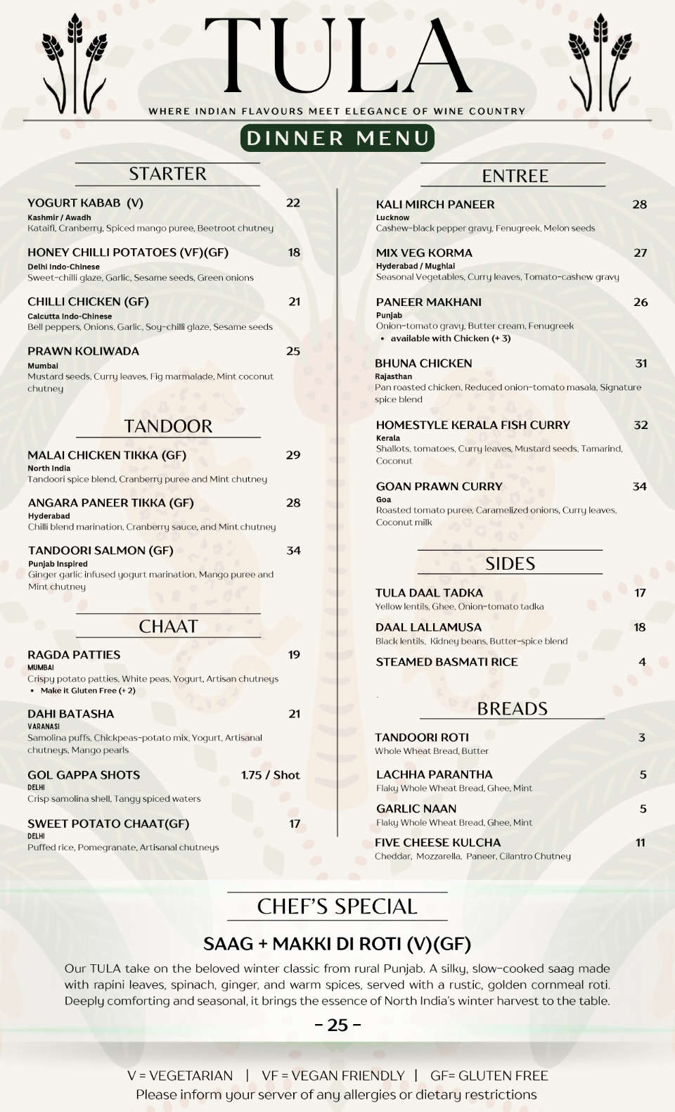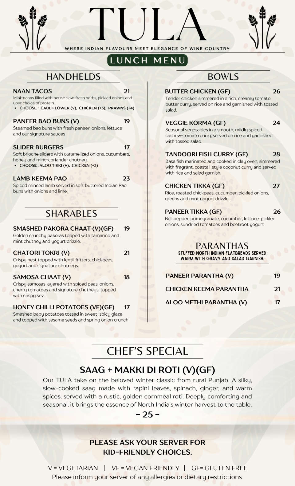 Nestled inside Little Straw Vineyards in West Kelowna, TULA Restaurant brings together the vibrant flavours of regional Indian cuisine and the fresh ingredients of Okanagan Valley. Our menu balances tradition and creativity, offering elegant dishes designed to pair beautifully with local wines. Join us for a unique wine-country dining experience where Indian heritage meets Okanagan hospitality.